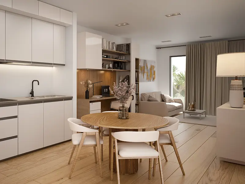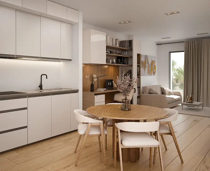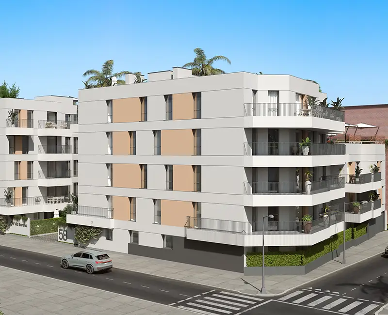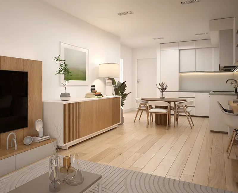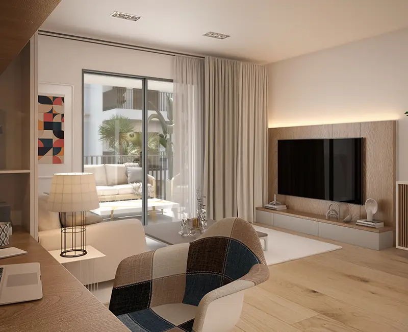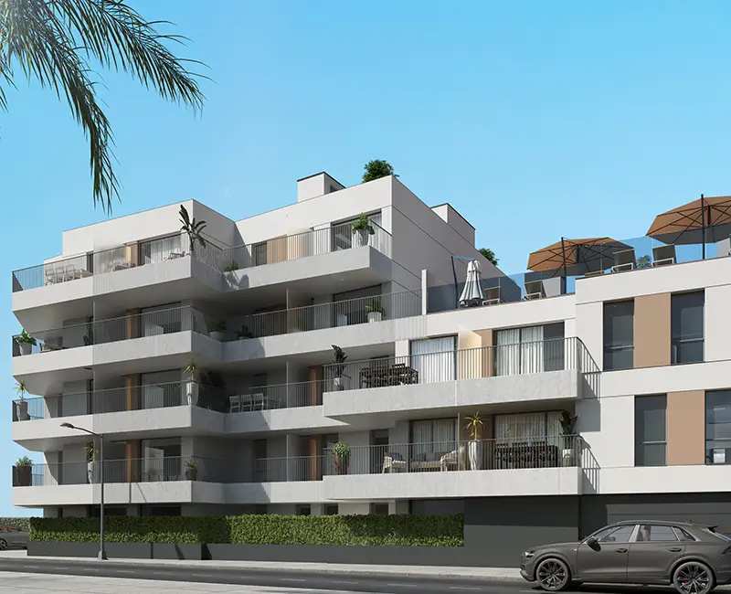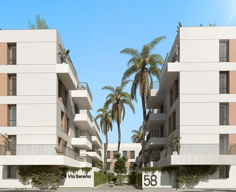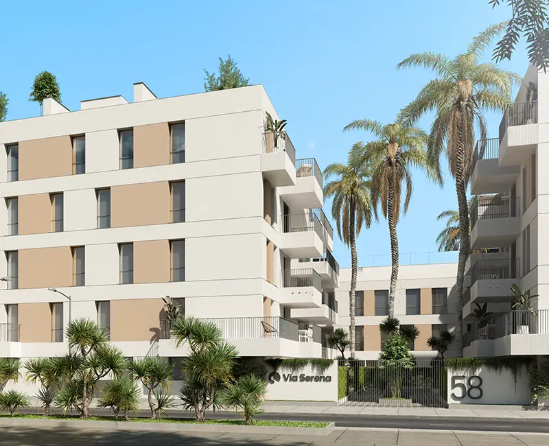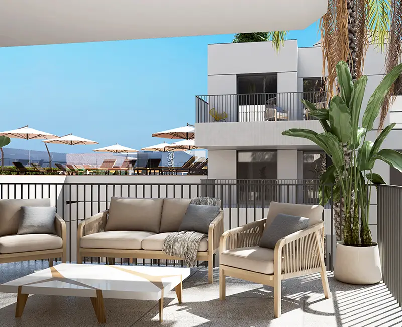 Aquí encontrarás hogares que respiran. Las tipologías 2, 3 dormitorios y amplios apartamentos de 1 dormitorio, priorizan la continuidad entre interior y exterior: salones abiertos que se prolongan en terrazas que iluminan y amplían la vida cotidiana.
