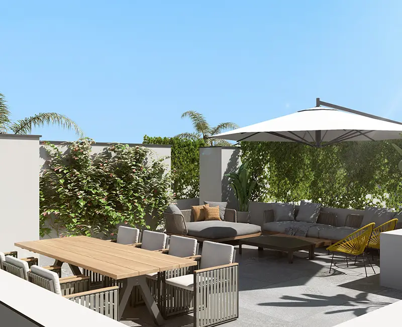 Los bajos ofrecen patios privados que funcionan como jardines urbanos, lugares íntimos para descansar, comer al aire libre o plantar un pequeño huerto. Los áticos elevan la experiencia con soláriums amplios: atardeceres y encuentros para recordar.