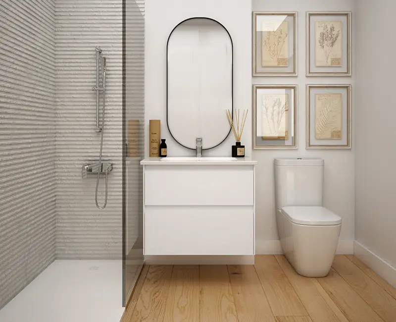 Materiales que envuelven nuestra vida. El suelo de gres cerámico efecto madera se extiende sin interrupciones por toda la vivienda salón, cocina, dormitorios y baños, reforzando la sensación de unidad y amplitud. Estará disponible en varias tonalidades, para que cada hogar refleje un estilo personal, el tuyo. Alicatado cerámico en zonas de ducha y bañera, con pintura en el resto del baño para un ambiente integrado, suave y envolvente. Paredes y techos en pintura lisa en tonos claros, que amplifica la luz natural y multiplica la sensación de calma y espacio.